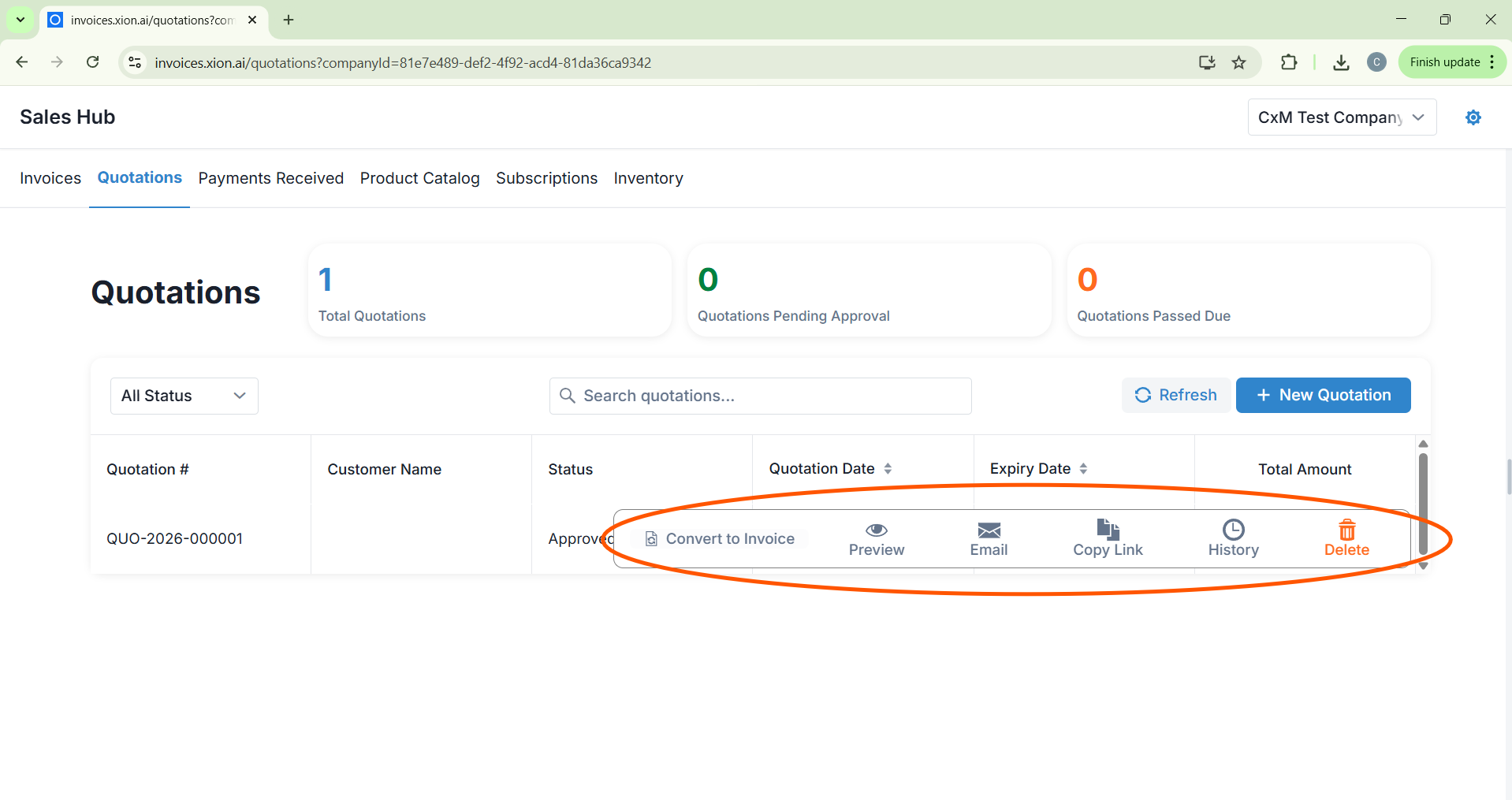 Locate the approved document in your Quotations ledger. Hover over the row to reveal the action menu.