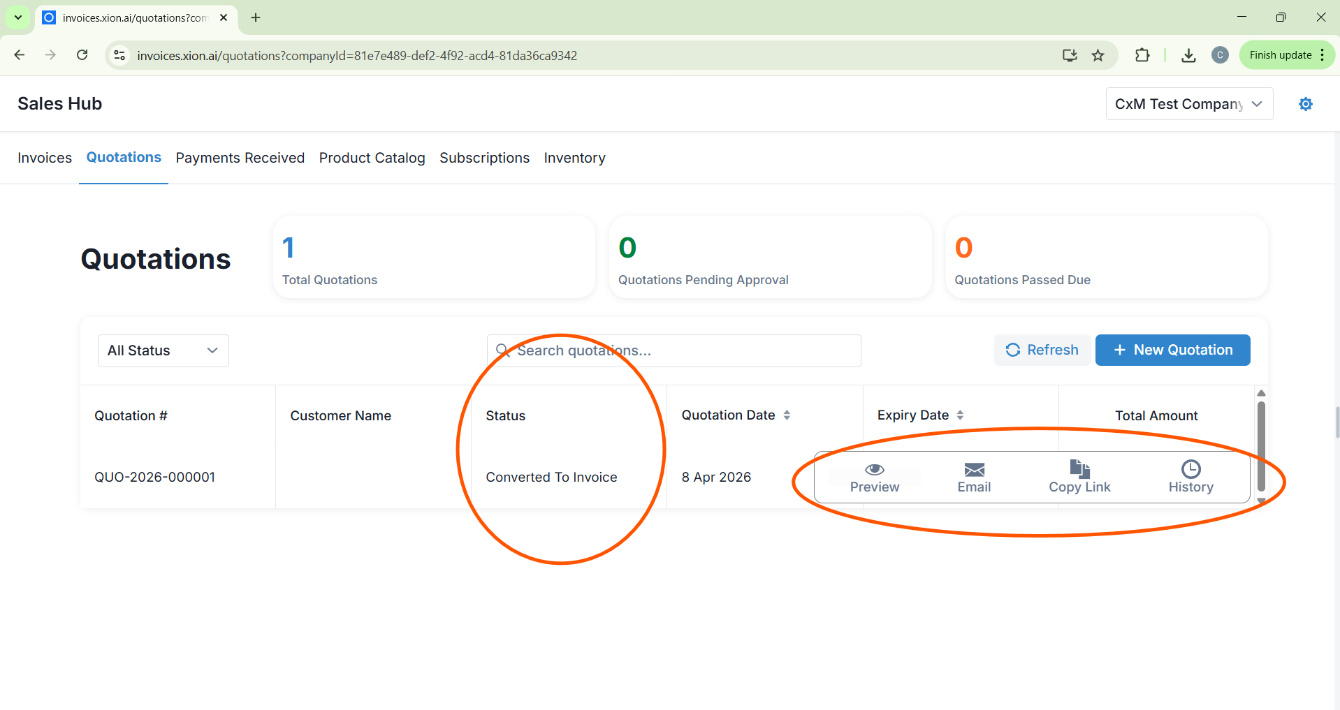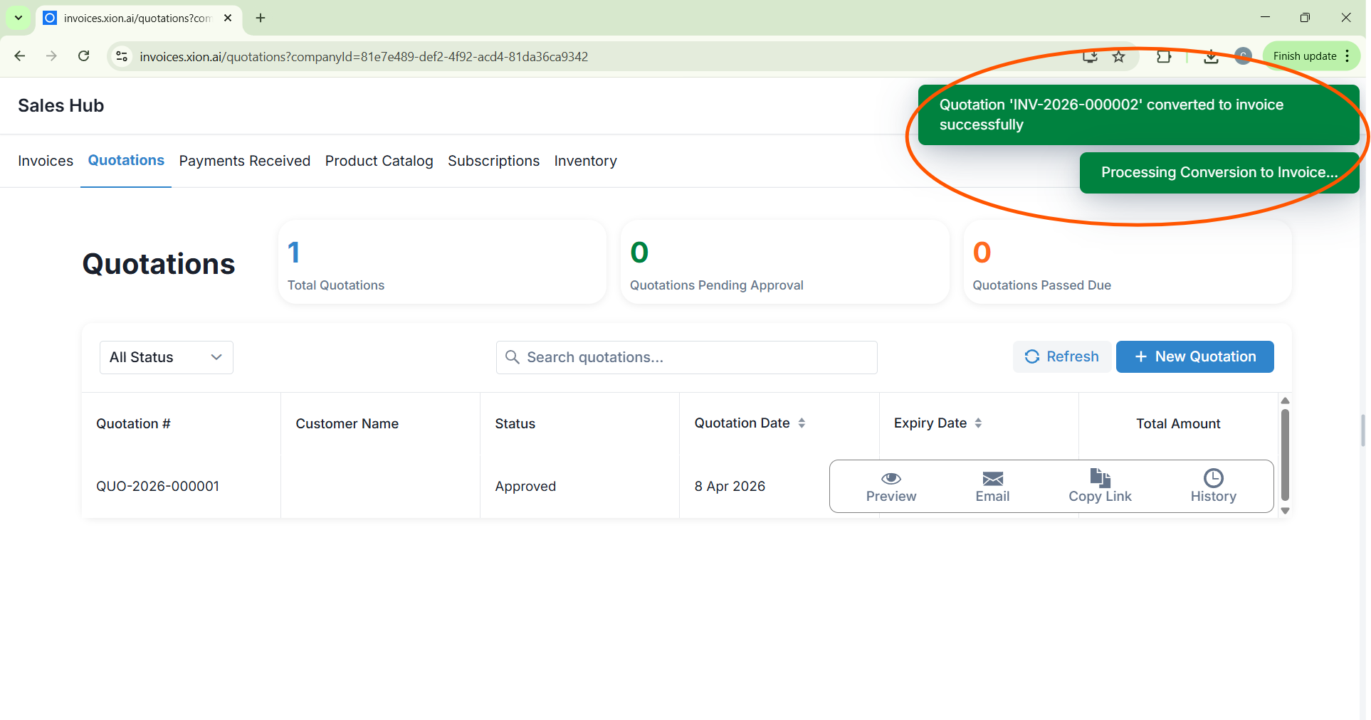 A “Quotation converted to Invoice successfully” success message will appear. The document will be moved automatically to your Invoices ledger, ready for final billing and collection.