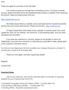 The To-Do list is email once the Onboarding Meeting with the respective CSM and accountant has been completed. Below is a sample email that the client will receive from Counto. It includes instructions on the next steps following onboarding, where to upload the required documents, the types of documents needed based on the meeting discussion